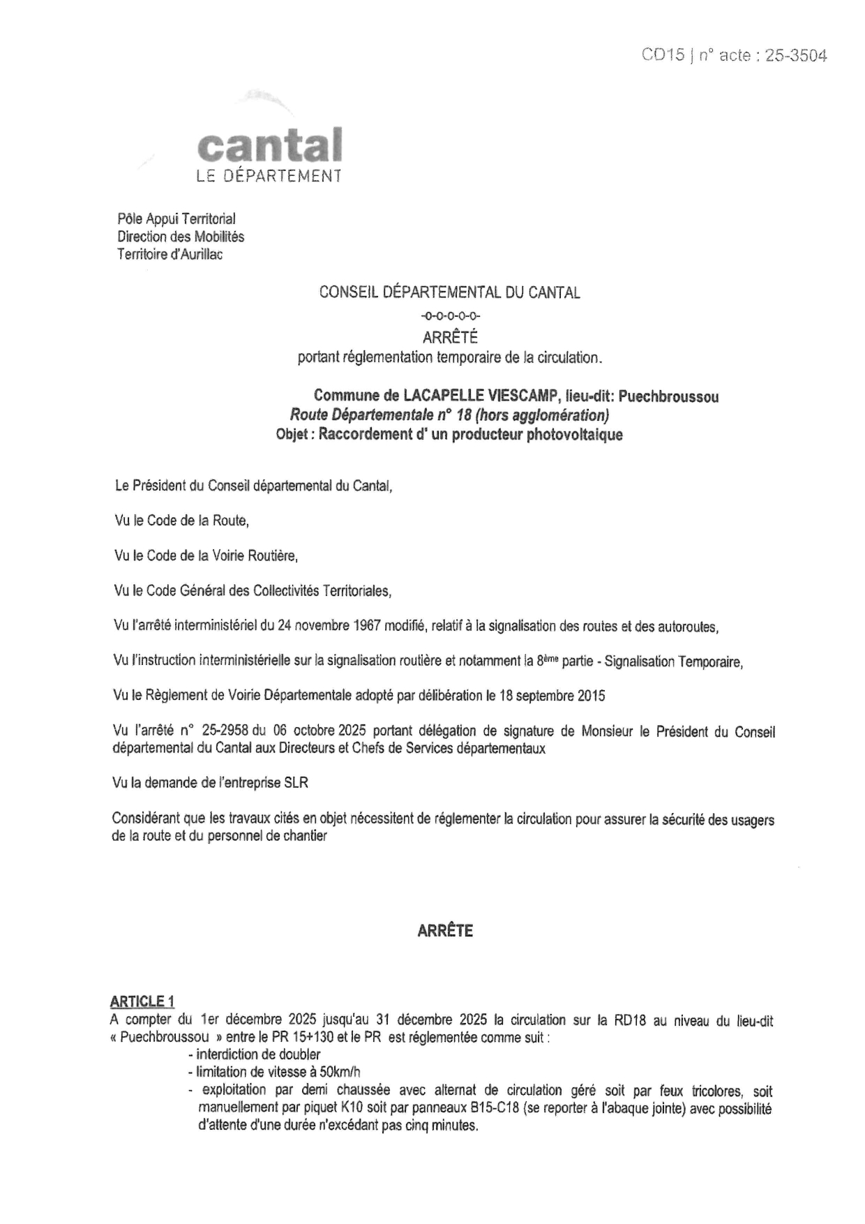 Dans le cadre du raccordement dâun producteur photovoltaĂŻque, une rĂ©glementation temporaire de la circulation sera mise en place au lieu-dit Puechbroussou sur la RD18, du 1er dĂ©cembre 2025 au 31 dĂ©cembre 2025.