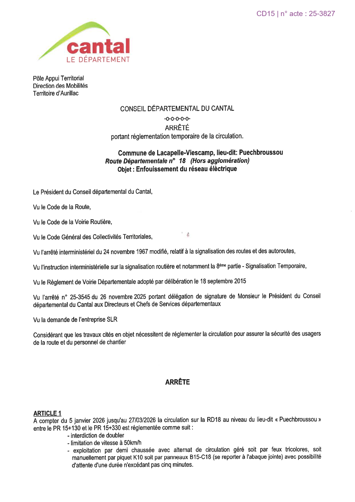 Dans le cadre des travaux dâenfouissement du rĂ©seau Ă©lectrique, un arrĂȘtĂ© de circulation a Ă©tĂ© pris par le DĂ©partement du Cantal concernant la RD18, au lieu-dit Puechbroussou.